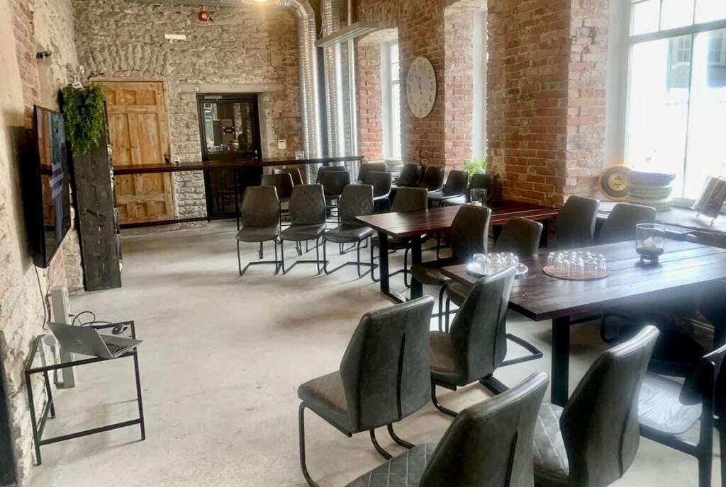 - Vastuvõtt või pidu. Meie avarad ruumid sobivad suurepäraselt – hubane sisekujundus, avarus ja palju aknaid, kõrged laed, muusika võimalus, ekraanid, lauad-toolid, mahutavus laudades istumisega kuni 34 in, vabamas formaadis kuni 60 in.