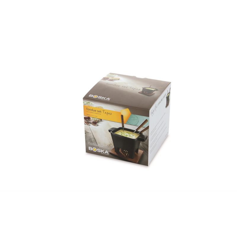 Tapas Fondue komplekt koosneb fondüü-potist, kahest väikesest fondüü-kahvlist ja tumedast puidust alusest. Komplekt on ilusas kinkekarbis – suurepärane kingiidee.